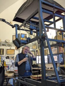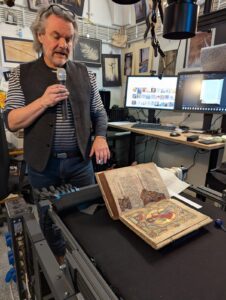 Ein absoluter Highlight war die Werkstattführung, bei der uns der Fotograf Gerald Raab Einblicke in seine Arbeit bei der Digitalisierung mittelalterlicher Handschriften gewährte. Hier prägt alles seine Handschrift: Das von ihm zusammengestellte photographische Equipment, die Art und Weise der Speicherung und Katalogiesierungs der Aufnahmen und die staunenswerte Präzision seiner Arbeit, die nicht nur fotographisches Können, sondern auch tiefes Verständnis für die Materialbeschaffenheit, den Zeitgeist und den Erhaltungszustand der zu Digiatlisierung ausgewählten Werke erfordert.
